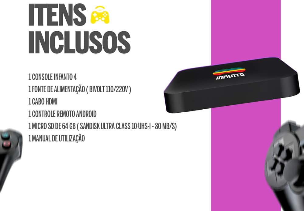 - 64GB MicroSD de Armazenamento para o sistema de jogos;