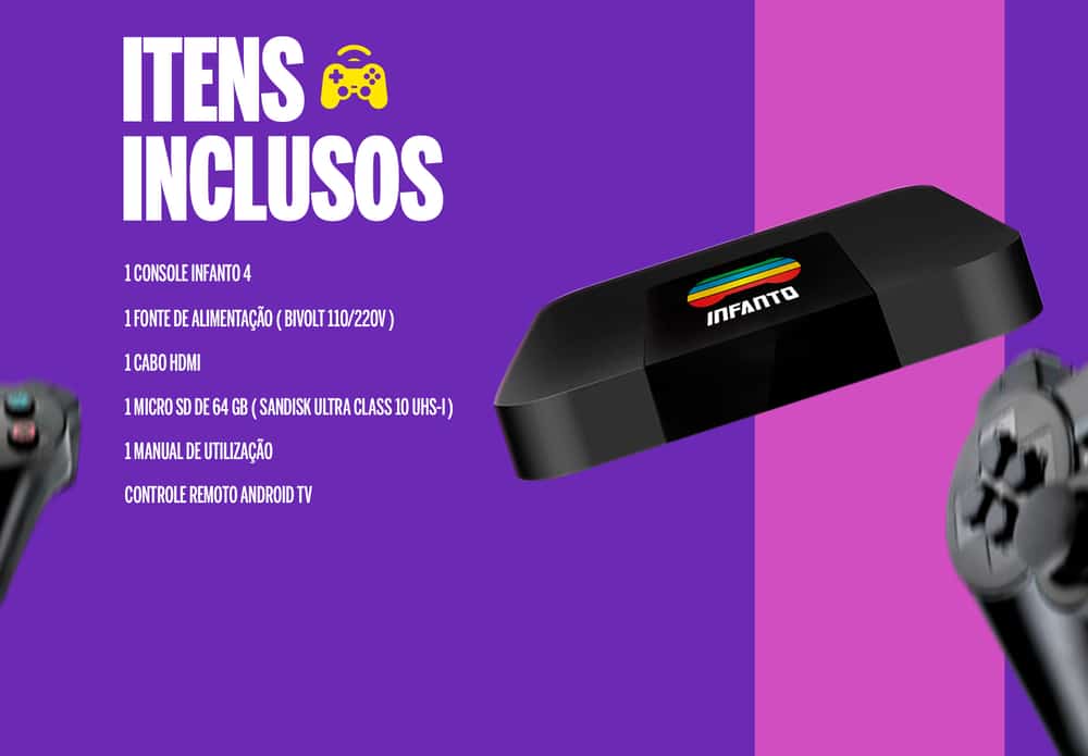 - 64GB MicroSD de Armazenamento para o sistema de jogos;