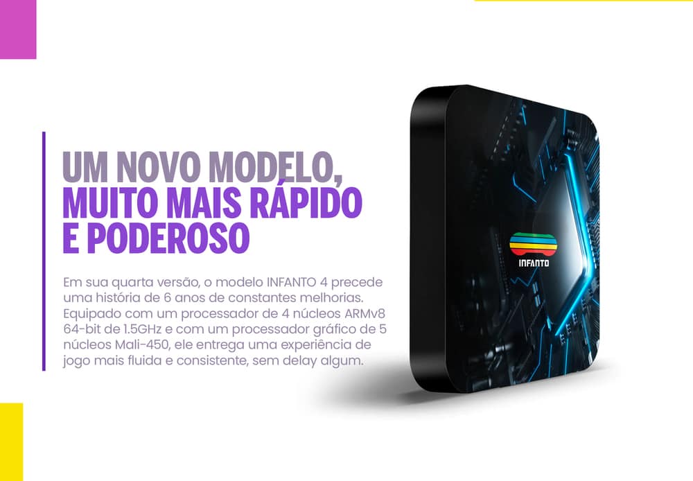 Realize a troca do seu videogame Infanto 3 pelo novo e mais potente videogame retrô Infanto 4.